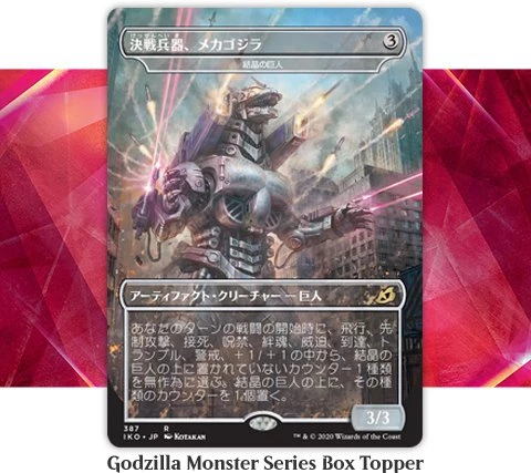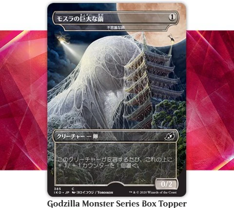 Unlike in English draft boosters, in 1 in 12 Japanese draft boosters of Ikoria: Lair of Behemoths you will find a Godzilla Monster Series Box Topper and one in three of these cards are foil! In addition, there are three exclusive box toppers for Japanese boosters that are not found in English boosters.