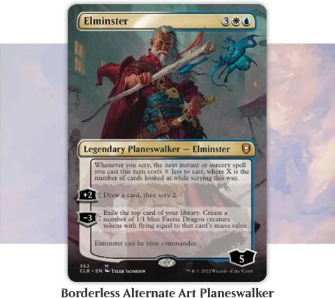 – 1 non-foil showcase of borderless rare or mythic rare.
