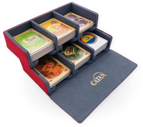 The Catan Trading Post offers an all-in-one solution for your Catan playing cards. This luxury box looks very stylish and contains enough space to store all Catan cards from the base game, including the 5-6 player expansion. This keeps your cards in optimal condition while playing, during transport and storing them. The top layer can be easily slid back for easy access to all cards and the lid is completely removable and can be used as a dice tray.