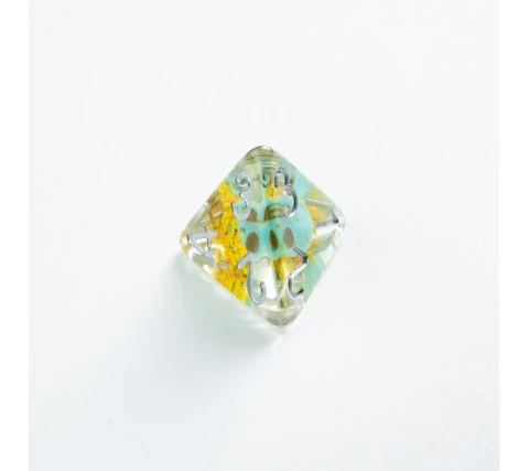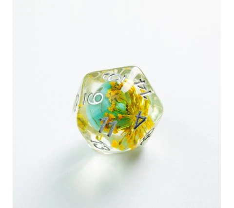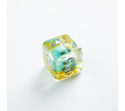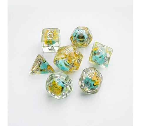 The Embraced Series dice are made of crystal clear resin with a fun or attractive object incorporated. The objects range from a ghost ship to a rubber duck. With these dice you really bring something unique to the table. Will your two-meter-tall muscular Barbarian be rolling rubber ducks soon?