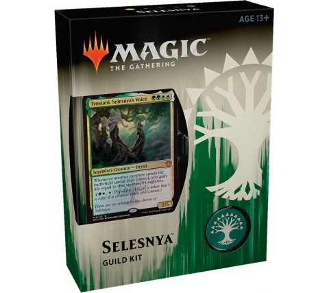 The decks are equipped with beautiful new basic lands with their guild logo. A rare or mythic with new art is of course also included. In addition, you will also find a spindown life counter, a sticker and a button with the guild symbol in the Guild Kit.