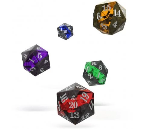 This set consists of five twenty-sided (or D20) dice in five different colorways, perfect for marking and keeping track of life totals, amount of tokens and all your different counters. The numbers on the dice drop from twenty to one to easily increase or decrease the number.