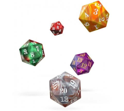 This set consists of five twenty-sided (or D20) dice in five different colorways, perfect for marking and keeping track of life totals, amount of tokens and all your different counters. The numbers on the dice drop from twenty to one to easily increase or decrease the number.