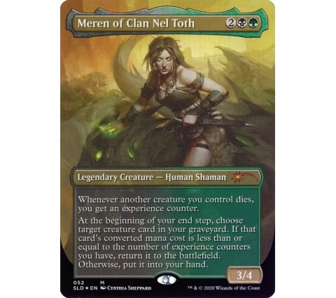 – one foil borderless alternate art Meren of Clan Nel Toth