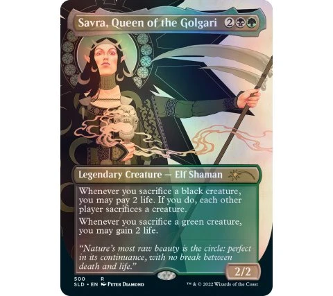 – one foil alternate borderless art Savra, Queen of the Golgari.