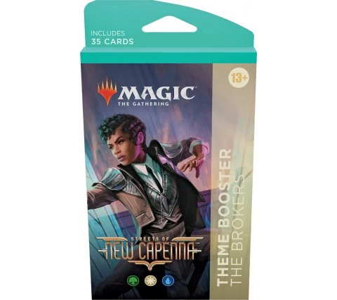 This set contains the five different theme boosters from Streets of New Capenna: Obscura, Maestros, Riveteers, Cabaretti and Brokers. Each theme booster contains 35 Magic: the Gathering cards, one of which is rare and several uncommons and commons. In more than one in eight theme boosters you will not find a rare, but a mythic rare!