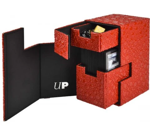 Leatherette deckbox with a beautiful red color and the relief feels like a real goblin skin. This deckbox is the ideal place to store more than 75 double sleeved cards in style. In addition, the Deckbox also offers space for dice, tokens and other accessories. Thanks to the handy removable trays can easily fill and empty the Deckbox. This deckbox is limited edition and will not be produced again after it has sold out.