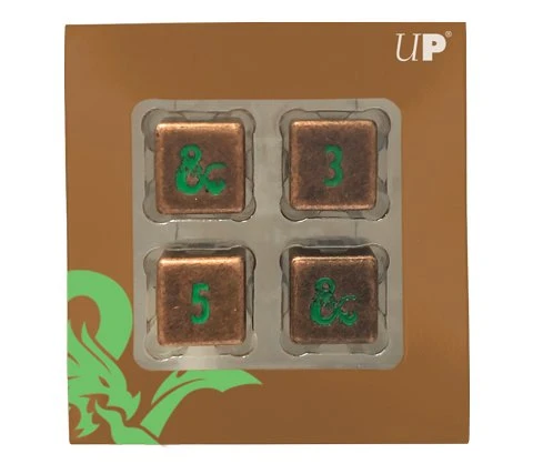 This set contains four six-sided dice (D6) with a random number pattern. The color of the dice is copper with green colored numbers and symbols. The number 6 on the die has been replaced by a Dungeons & Dragons symbol.
