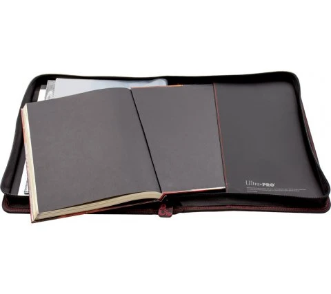 An extra luxurious binder with embroidered Dungeons & Dragons logo in a red color. This binder contains 10 deluxe 1-pocket pages for your character sheets and six 18-pocket pages for 108 standard size spell cards. The binder has a sturdy zipper for optimal protection of your cards and character sheets, has a special space for pens and pencils and comes with an official Dungeons & Dragons notepad. This version also has a space to securely store one Dungeons & Dragons book.