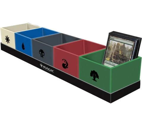 This card display case is the ideal display for your basic lands or for showing off your favorite Magic cards. A must-have when playing Magic: the Gathering formats such as booster draft or sealed deck and always have your lands neatly sorted for deck building. The display case consists of 5 strong card trays in which the mana symbols are engraved. Each card tray has room for over 100 cards in Ultra Pro Deck Protector Sleeves.